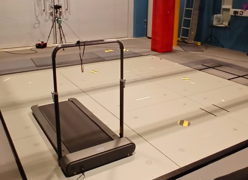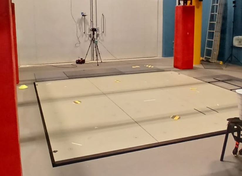 A 3.7m x 3.7m octopod motion platform (designed and built by E2M) within an 8m x 8m room. The platform moves on six degrees of freedom: Z-axis (vertical motion); X axis (anterior-posterior); Y axis (medio-lateral), and then a series of movements which involve rotation about Z-axis (yaw), Y-axis (pitch)) and X-axis (roll). It is designed for high fidelity reproduction of small motion signals with limits set at maximum displacement +/- 21 mm and maximum acceleration 2 m/s², the upper limit equating approximately to significant discomfort experienced by humans. This enables simulation of a wide range of scenarios in the frequency range from 0 to 40 Hz. This platform can replicate actual data recorded from real environment situations (examples include vibration in floors, ship sway and train motion). The motion platform is secured onto an isolation block to prevent interference with environmental vibration. Within the motion platform there are nine contiguous AMTI multi-axial force plates offering the ability to capture data and analyse human balance and gait. The force plates were custom built for the VSimulators facility by AMTI, providing 2,000lb (8900N) capacity within each 1197mm x 1197mm force plate surface area.