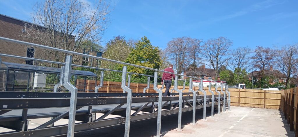 A lively lightweight Warwick Footbridge (WF) made of FRP is located at the University of Warwick Science Park. The WF bridge is 19.8 m long and 2.35 m wide (2.1 m deck area). It is overhanging on both sides and sits on four steel bearing supports, including a roller at one end, to create a simply supported condition. The span length is 16.8 m. Top and bottom chords are of back-to-back EXTREN®152 × 41 × 6.4 FRP channel sections with vertical and diagonal elements of EXTREN®50.8 × 6.4 FRP box section. Channel sections are used also for the transverse beams support the FRP decking of SafPlank (51 mm deep). Stainless steel bolts, with Nyloc nuts to reduce loosening from vibration actions, are used in all connections. Since sections of only 6.4mm thickness are required, the total weight is very low at 1400 kg, or 71 kg/m.